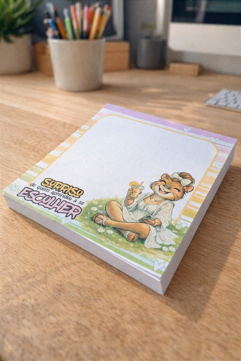 Prático e divertido, o bloco de anotações Sorriso facilita organizar suas tarefas com um toque especial. Ideal para anotar recados, lembretes e ideias no dia a dia.
